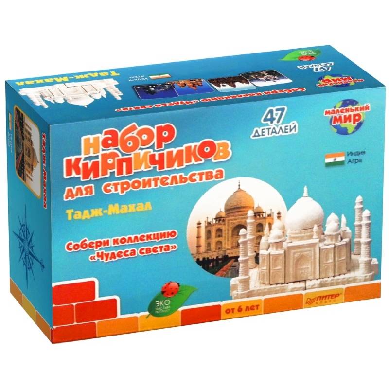 Набор кирпичиков для строительства. 41 деталь. Соберите всю коллекцию конструкторов из кирпичиков 'Чудеса света' и воссоздайте памятники прошлых и современных цивилизаций. Как играть: - Нанесите полученный раствор на кирпичики и плотно прижмите их друг к другу. - С помощью мастерка из набора и влажной тряпочки удалите лишний раствор с деталей конструктора. - Когда макет будет закончен, просушите его в течение 8 часов, после чего протрите чистой сухой тряпочкой. Как разобрать макет и построить его заново: - Опустите конструкцию в емкость с водой и оставьте там на 30 - 60 минут, пока не растворится цемент. - Промойте кирпичики. - Высушенный в лотке цемент можно использовать повторно. - Теперь вы можете начать строить заново! Как получить цементный раствор: Небольшими порциями, медленно помешивая, добавьте цементный порошок в воду (4 части цемента на 1 часть воды). Полученную массу продолжайте помешивать, пока она не станет однородной. Обратите внимание: если раствор получится слишком жидким, добавьте еще цементного порошка. Для детей от 6 лет.