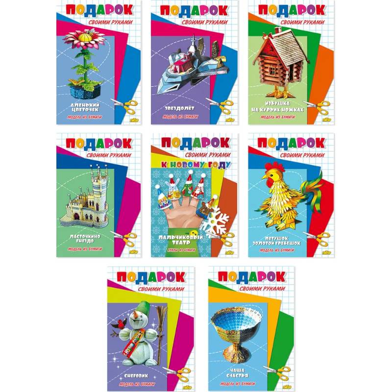 Серия 'Подарок своими руками'. Все любят дарить подарки. Не важно, будет ли это какой-то дорогой подарок или совсем скромный. Главное, чтобы он был сделан от чистого сердца. А уж если его смастерить к тому же собственными руками, он наверняка станет самым памятным и дорогим для родителей, бабушек и дедушек, других близких людей, да и запомнится на всю жизнь. Предлагаемая новогодняя серия моделей из бумаги позволит вам подарить такой запоминающийся подарок, а также украсить дом к Новому году и порадовать близких новогодним представлением с участием бумажных пальчиковых кукол.
