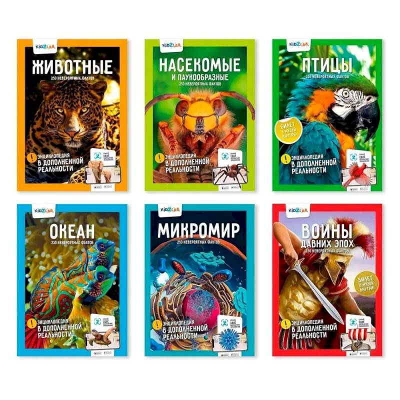 1. 'Животные'. Какое самое древнее животное на Земле? Кто громче всех рычит? Какая птичка умеет летать задом наперёд? Наша энциклопедия собрала в себе 250 невероятных фактов, в которых содержатся ответы на эти и многие другие вопросы. Эта книга приглашает тебя в царство животных, где можно встретить разнообразных зверей, от муравья до слона. Кроме того, это необычная энциклопедия: каждого читателя ждёт сюрприз в дополненной реальности. Скачай бесплатное приложение и познакомься с обитателями нашей планеты, которые не вошли в книгу. Почувствуй себя настоящим исследователем и узнай много невероятного!